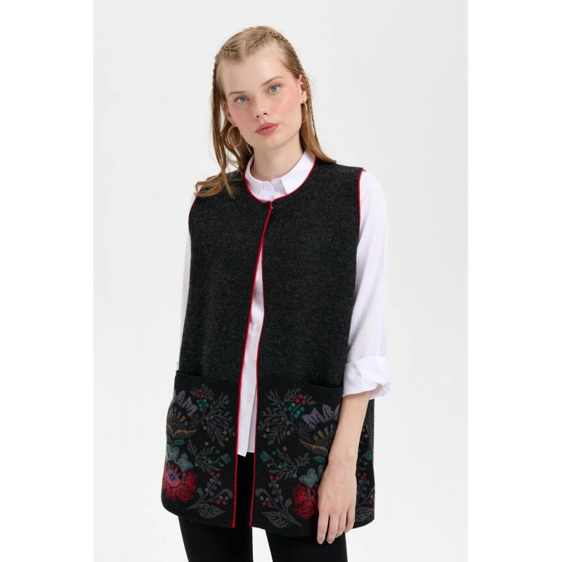 Desen Triko Üst Ve Arkası Keçe Eteği Jakarlı Triko Kadın Yelek 24076D (24076D)
