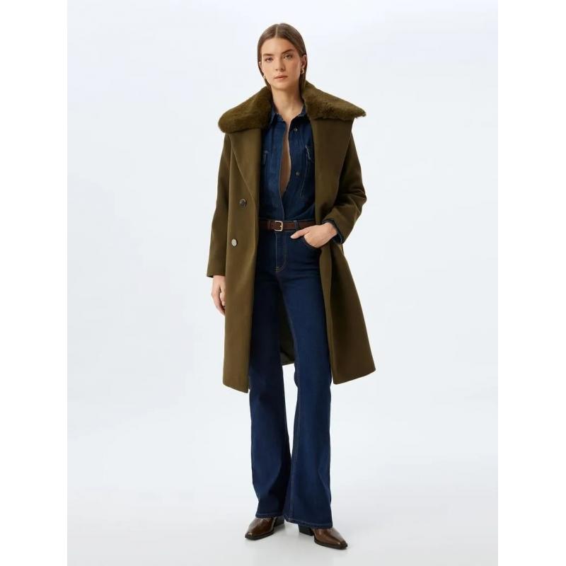 Koton Kaşe Çıkarılabilir Suni Kürk Yaka Kruvaze Düğmeli Kemerli Cepli Kadın Kaban (5WAK00190EW)