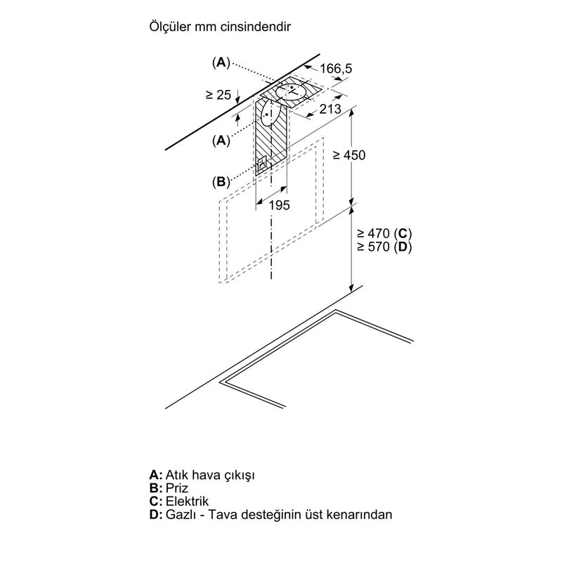 | Gazlı ocak üzerindeki minimum mesafe | 650 mm |