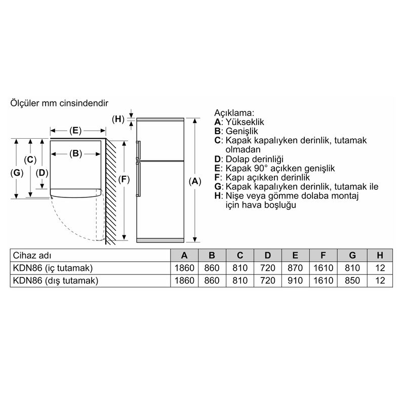 | İç Ünite Ölçüler (Yükseklik x Genişlik x Derinlik) | 1860 x 860 x 800 mm |