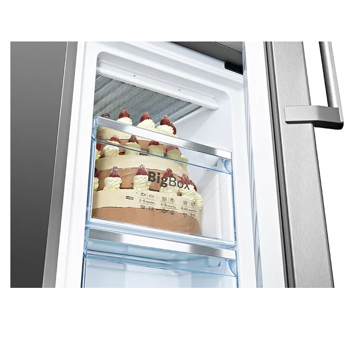 BigBox size çok geniş hacimli bir alan sunar. Bu sayede örneğin büyük bütün bir hindiyi veya uzun bir kuzu kolunu saklayabilirsiniz. Üstelik BigBox bölmesinin üst çekmecesini ve aradaki cam rafı kaldırabilir ve böylece daha uzun yiyeceklere yer açabilirsiniz. VarioZone özelliği sayesinde dondurucu bölmesindeki tüm çekmeceler kolayca çıkarılabilir ve böylece gerektiğinde daha fazla alan kazanılır. Bu alanda isterseniz 3 katlı kocaman bir doğumgünü pastasını saklayabilirsiniz. VarioZone size geniş ve esnek bir dondurucu alanı sunar.