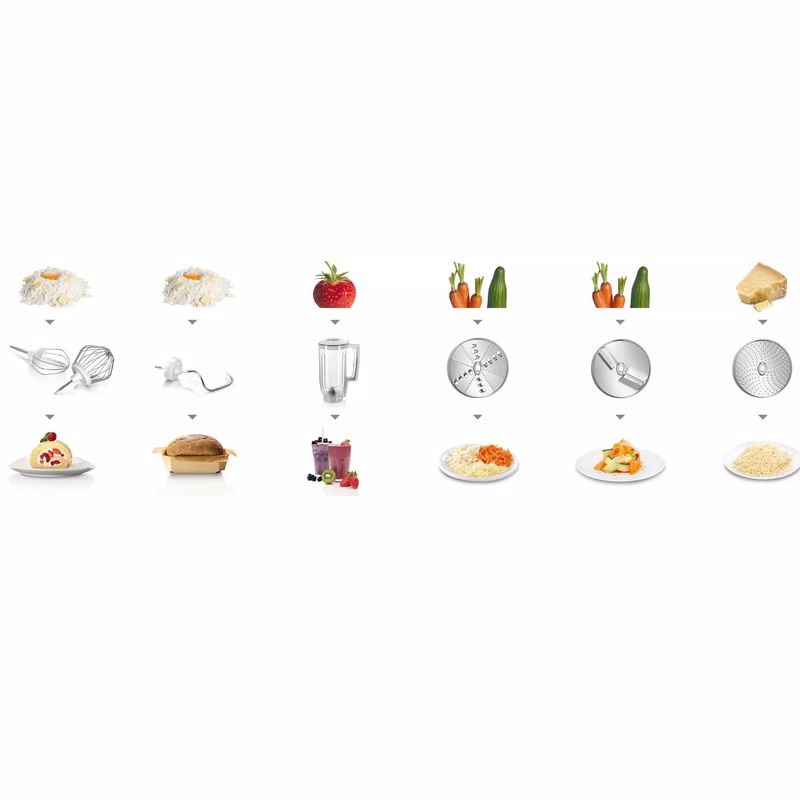 | Entegre aksesuarlar | 1 x Kapak, 1 x Devamlı ısıtıcı, 1 x Paslanmaz çelikten karıştırma kabı, 1 x Karıştırma kancası, metal, 1 x Mikser parçası, plastik, 1 x Çevrilebilir raspa diski, 1 x Orta incelikte rendeleme diski, 1 x Karıştırma teli, 1 x Çırpma teli, 1 x Çift taraflı kesme diski |