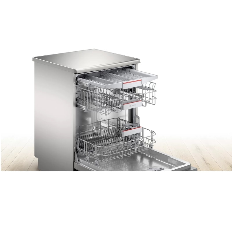 Rackmatic teknolojisi sayesinde basit bir el hareketiyle üst sepetin yüksekliğini, makine doluyken bile 3 farklı kademede ayarlayabilirsiniz. Böylece alt sepete büyük tabak ve tencereleri veya üst sepete uzun kadehleri kolayca yerleştirmiş olursunuz. Bosch bulaşık makinelerinde Rackmatic sayesinde her zaman, büyük tencerelere veya uzun kadehlere yer var.