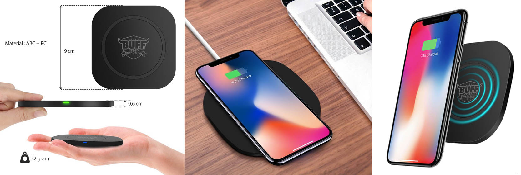 Buff NT1 kablosuz şarj cihazı şık, ince ve yenilikçi bir tasarıma sahiptir. Kompak bir yapıya sahip olduğu için kullanımı kolaydır ve cebinizde rahatlıkla taşıyabilecek boyutlardadır.