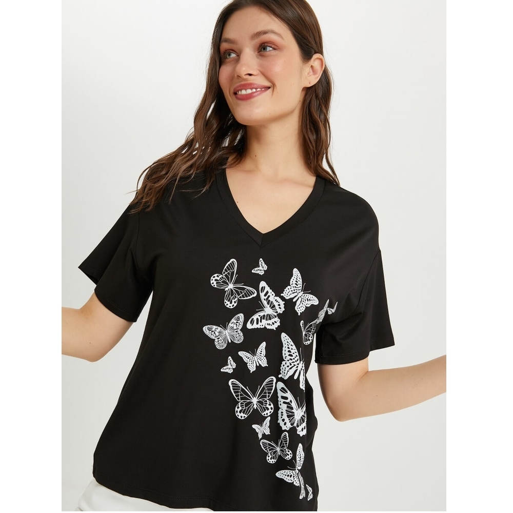 Faik Sönmez Kadın Önü Kelebek Baskılı V Yaka T-Shirt (U64461)