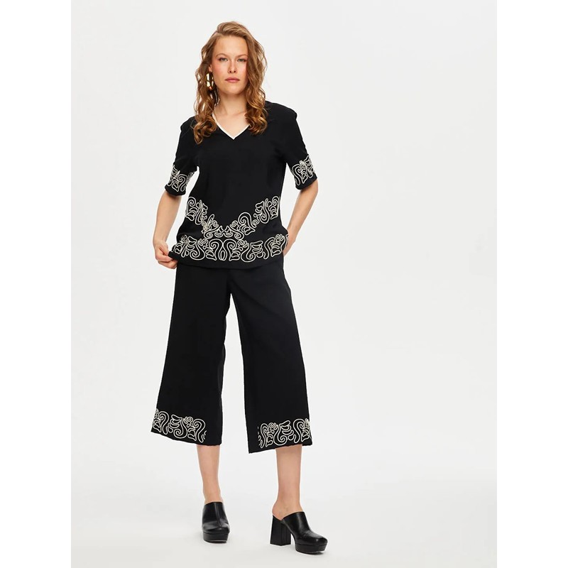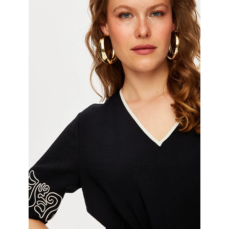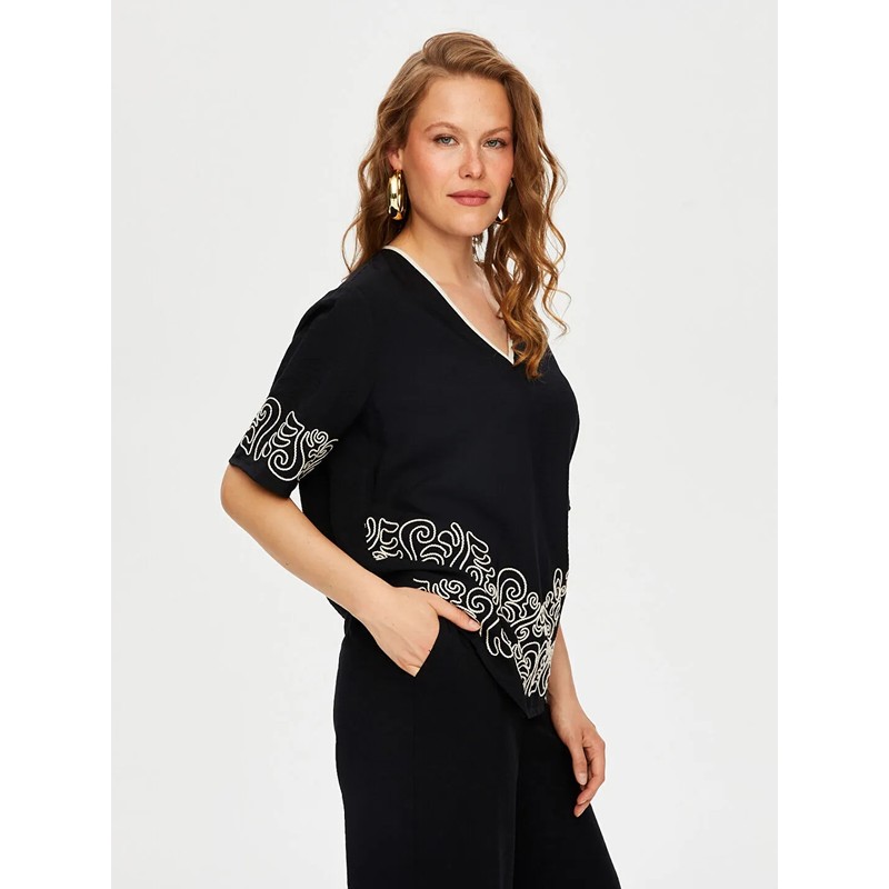 Faik Sönmez Kordone Nakış Detaylı V Yaka Kısa Kollu Kadın Bluz US25BLZ024 (US25BLZ024)