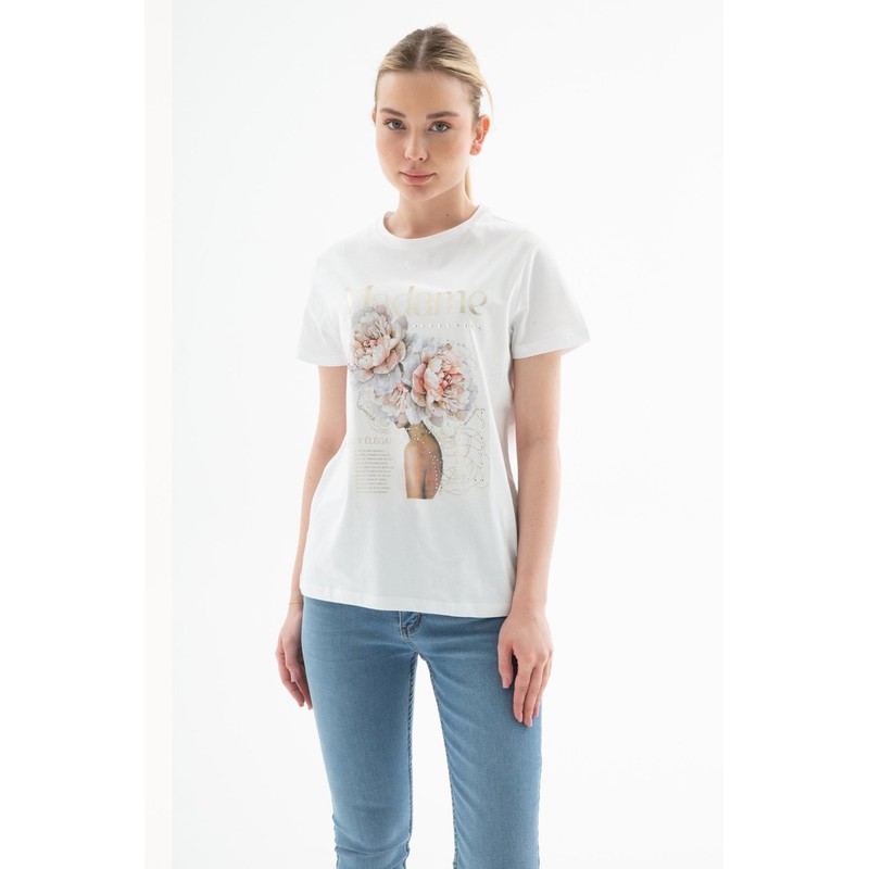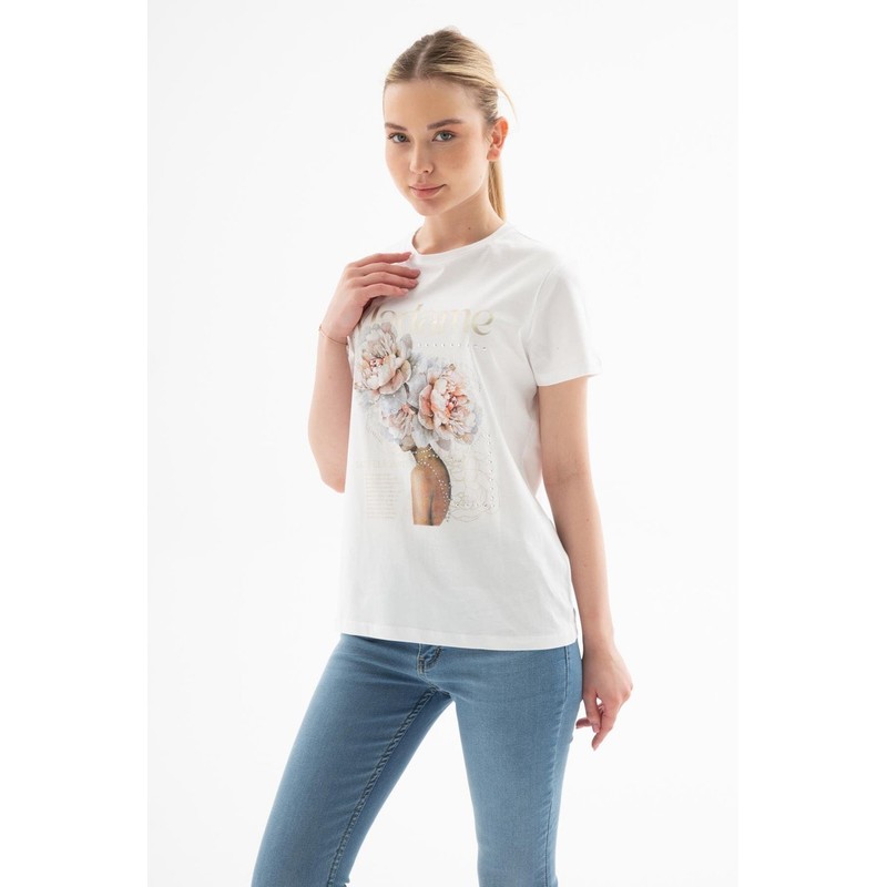 Baskılı Bluz Beyaz - Kadın %100 Pamuk, Örme| Fashion Friends Model Ölçüleri:Boy:1.70, Göğüs:90, Bel:68, Basen:90 Mankenin üzerindeki ürün S/28/36 bedendir.Yorumlar (0)
