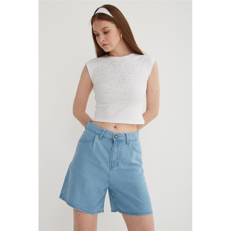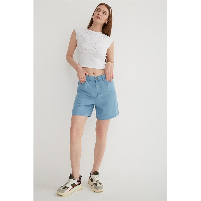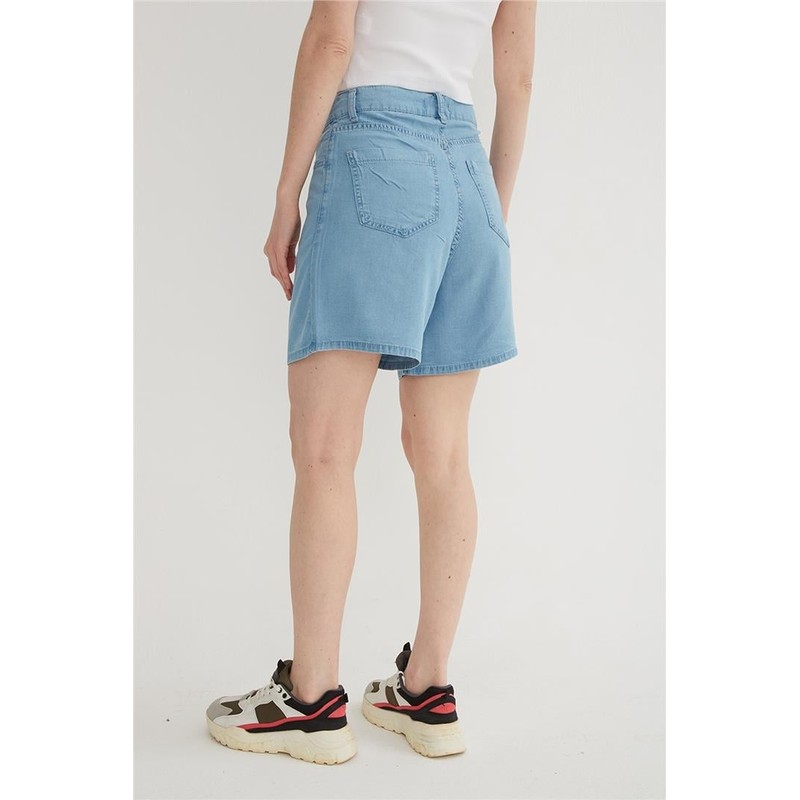 Denim Şort Mavi - Kadın Yüksek Bel, %100 Tencel, Denim| Fashion Friends Model Ölçüleri:Boy:1.70, Göğüs:90, Bel:68, Basen:90 Mankenin üzerindeki ürün S/28/36 bedendir.Ödeme Seçenekleri