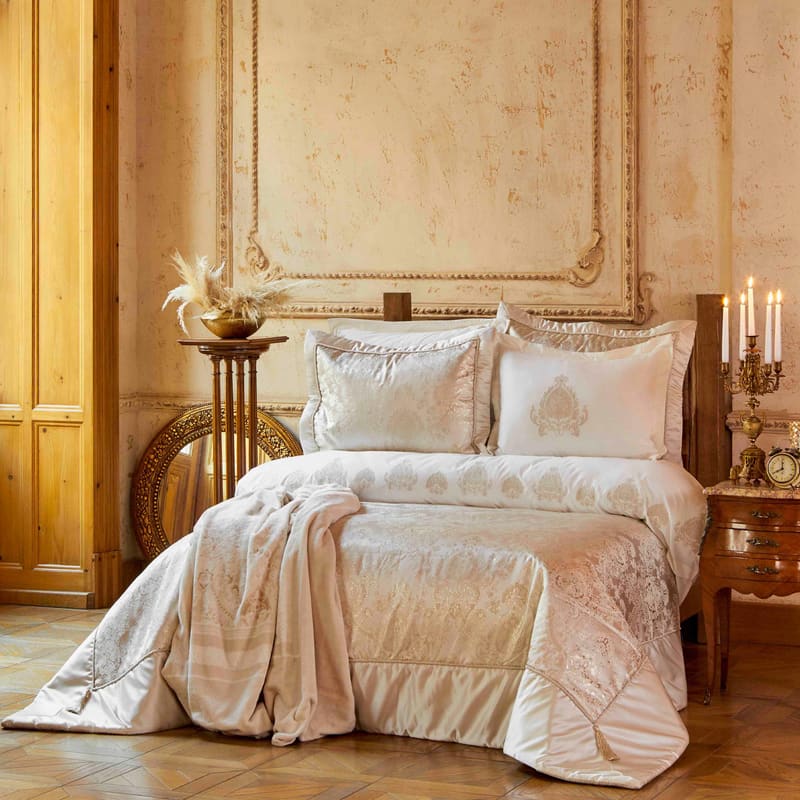 Işıltılı ve zarif… Ilona Gold 10 Parça Çeyiz Seti şıklığıyla göz doldururken, ihtiyacınız olan tüm ürünleri de içinde barındıran oldukça pratik ve kullanışlı bir evlilik paketidir. Güzelliği ile herkesi kendine hayran bırakacak bu setin içeriğinde yatak örtüsü, baskılı battaniye, nakışlı nevresim takımı, çarşaf, iki adet yatak örtüsü yastığı, iki adet volanlı yastık kılıfı ve iki adet volanlı nakışlı yastık kılıfı bulunmaktadır.