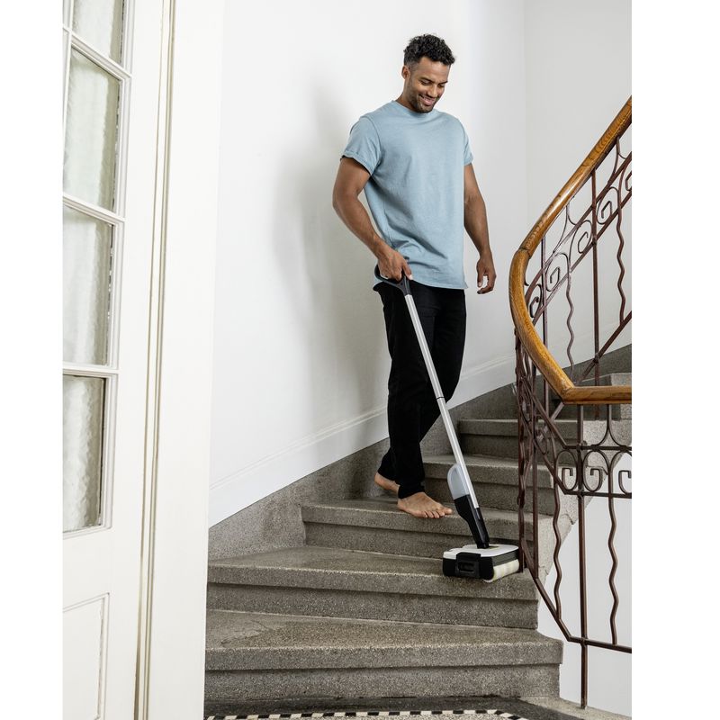 Karcher FC 2-4 bataryalı zemin temizleme makinesi, kendi kendini taşıyan tasarımı, yalnızca 2,2 kilogramlık düşük ağırlığı ve otomatik açılıp kapanması ile etkileyicidir. Bunu yapmak için, kuru ve ıslak günlük kiri başlatmak ve tek bir adımda çok rahat bir şekilde çıkarmak için temizleyicinin tutamacını geriye doğru çekin. Maksimum pil ömrü 20 dakikadır, bu da 70 metrekarelik bir temizleme alanına karşılık gelir. Cihaz devreye girdikten sonra rulo otomatik olarak temiz su deposundan gelen su ile nemlendirilir. Bu da sert zeminlerin eşit ve etkili bir şekilde temizlenmesini sağlar. Aynı zamanda esnek başlığı ve tasarımı sayesinde uçlara kadar temizlik yapar ve entegre saç filtreleri sayesinde tüylerin kolay toplanmasını sağlar.Hijyenik atık su deposu sayesinde kir ile temas da önlenir böylece temiz su ile temizlik yapmış olursunuz. Birlikte verilen 4 V Karcher Battery Power değiştirilebilir batarya, tüm 4 V Karcher Battery Power cihazlarıyla uyumludur.