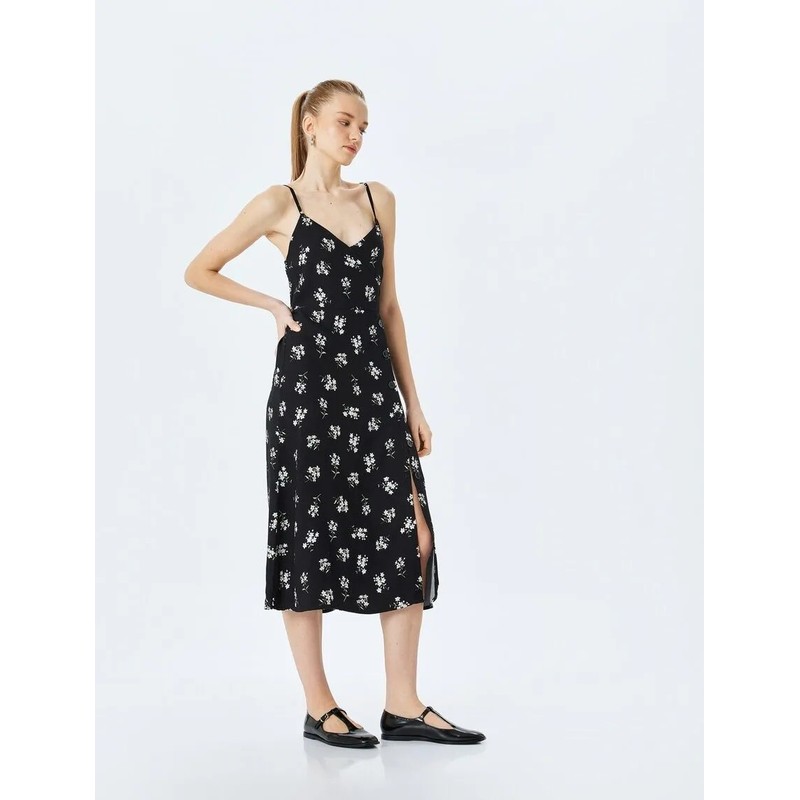 Koton İp Askılı Kruvaze Yaka Çiçekli Düğmeli Viskon Kadın Midi Elbise 5SAL80031IW (5SAL80031IW)