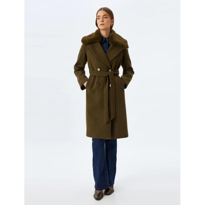 Koton Kaşe Çıkarılabilir Suni Kürk Yaka Kruvaze Düğmeli Kemerli Cepli Kadın Kaban (5WAK00190EW)