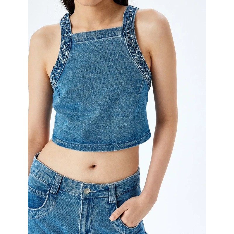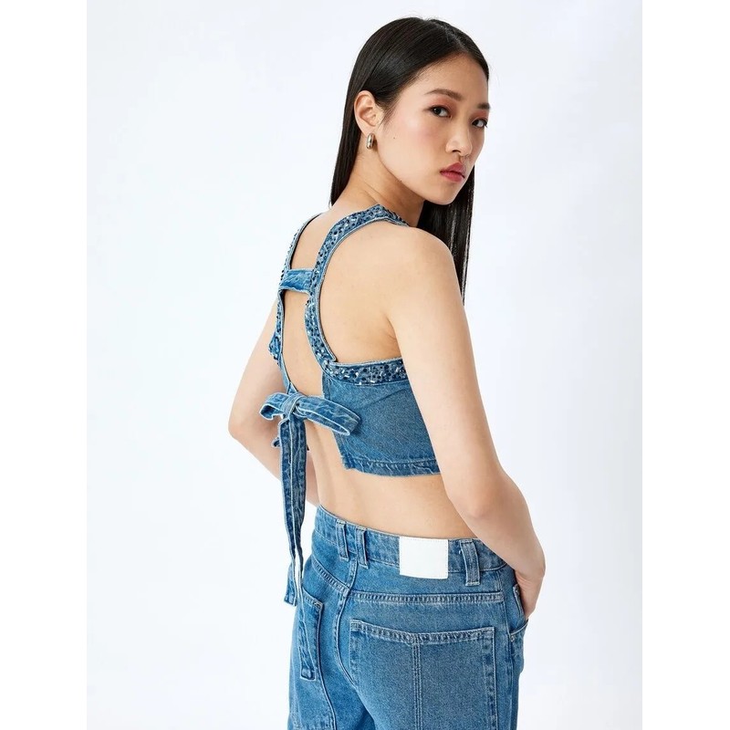 Koton Taş Detaylı Sırtı Bağcıklı Crop Kolsuz Kadın Denim Bluz 5SAL30004MD (5SAL30004MD)