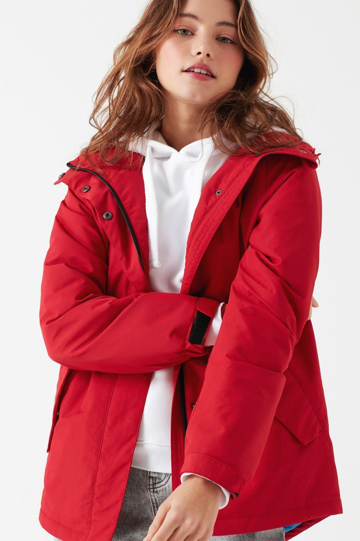 Mavi Kapüşonlu Kadın Kırmızı Mont (110423-27125)
