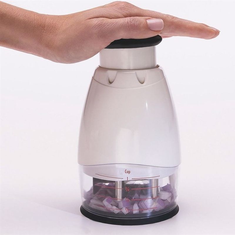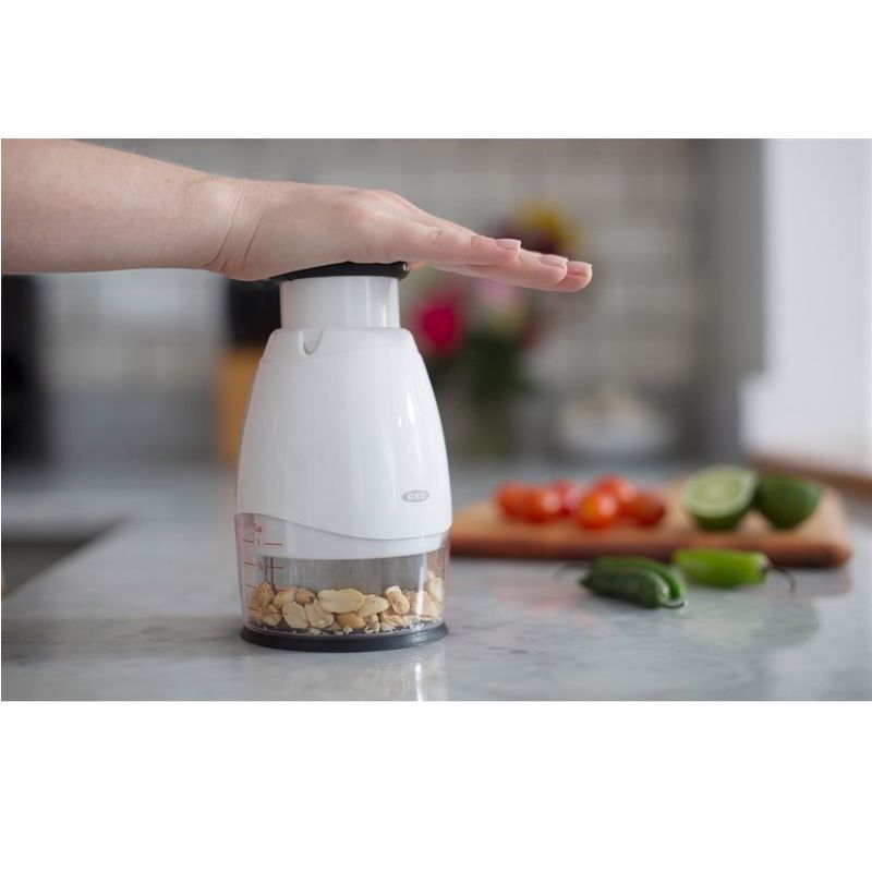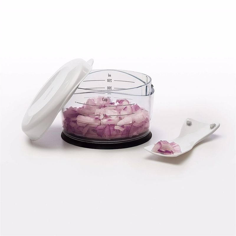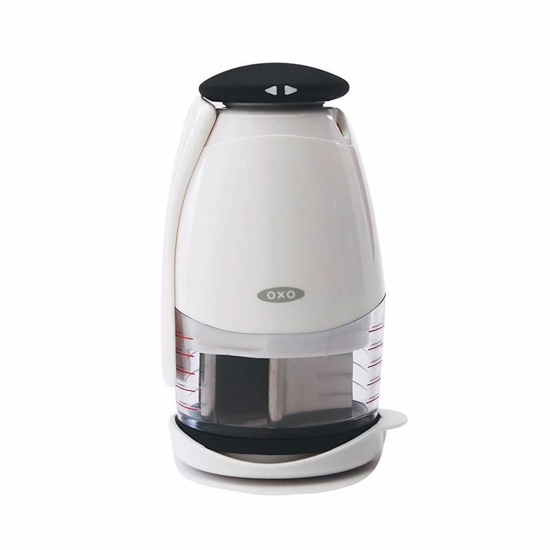 OXO Good Grips Sebze Doğrayıcı ile soğan, havuç ve daha fazlasını doğrayın. Düğmeye basın ve bıçaklar eşit bir sonuç için döner. Dahili yumuşak tampon, ekstra konfor için her darbeyi emer. Malzemeleri yumuşak, kaymaz tabanı ile birlikte verilen ölçüm kabında doğrayın. Ölçüm kabında bir sıyırıcı döner ve yan duvarlarda birikmeyi önler. Doğrama bıçağının tamamı kolayca sökülebilir, bu da temizliği kolaylaştırır. Sebze Doğrayıcı bir kaşık içerir, böylece elleriniz bir daha asla soğan veya sarımsak gibi kokmaz.