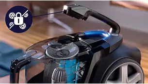 Alerji Kilit sistemi, çalıştırmadan önce toz haznesinin tam olarak kapatıldığından emin olmak için bir sensör kullanır. Temiz ve ultra hijyenik bir ortam için tozu ve alerjenleri hapseder.