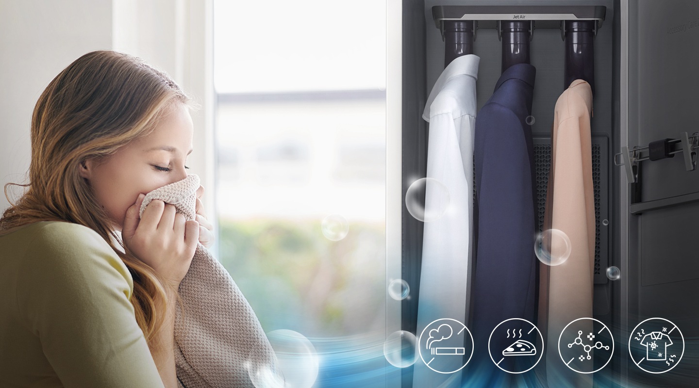 Giysilerinizin hem içindeki hem de dışındaki tozu ve kokuyu hızlı ve sessiz bir şekilde giderebilirsiniz. Jet Air sistemi ve Air Hangers teknolojisinin sahip olduğu güçlü jet püskürtücüler havayı aşağı ve yukarı doğru üfler, böylece giysilerinizin ulaşılması en zor köşelerine yerleşmiş tozları yerinden sökerek onlardan kurtulmanızı sağlar. Ayrıca, çalışırken daha az titreşim ve çok daha az gürültü çıkarır*!