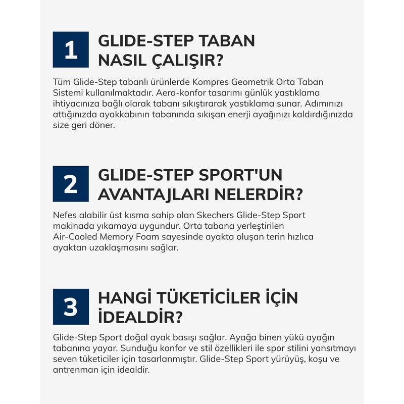 Ürün Kodu: 232270 NVOR %100 tekstil malzemelerden üretilmiştir Bağcıklı ve konforlu spor ayakkabısı olarak tasarlanmıştır Yumuşak ve atletik örgü kumaş saya kullanılmıştır Air Cooled Memory Foam yastıklı, konforlu ve hava alma özelliği olan iç taban teknolojisi kullanılmıştır Konfor sunan geometrik yastıklı Glide Step orta taban teknolojisine sahiptir Yer tutuşu sağlayan süper esnek kauçuk dış tabana sahiptir Topuk yüksekliği 1,5 cm'dir Makinede yıkanabilir tasarım ile hassas programda soğuk suyla yıkanmaya ve asarak kurutulmaya uygundur Nefes alabilir tasarıma sahiptir Glide Step Sport - Wave Heat erkek spor ayakkabı sayasında kullanılan yumuşak kumaş sayesinde gün boyu ayaklarınızda hafiflik ve konfor hissini garanti eder. Glide Step Sport - Wave Heat erkek spor ayakkabının geometrik şekilli tabanı ile kontrast renkteki sayası oldukça sade ve yalın bir tasarıma sahiptir. Ayakkabının geri kalanındaki canlı renklerle bir tezat oluşturan bu saya gün boyu hava alması ve esnekliği sayesinde ayaklarınızı mutlu eder. Glide Step Sport - Wave Heat erkek spor ayakkabının iç tabanında kullanılan Air Cooled Memory Foam sayesinde gün boyunca ayağınızın her noktasından desteklenerek adım atmanın keyfini çıkartırsınız. Bu özel iç taban ayaklarınızın şeklini alarak mükemmel yastıklama yapmakla kalmaz, aynı zamanda da hava alarak ayak sağlığınızı korumanız konusunda size destek olur. Glide Step Sport - Wave Heat erkek spor ayakkabının orta tabanında kullanılan özel Glide Step teknolojisi sizi yol boyunca bastığınız taşları, pürüzleri ve çukurları hissetmekten korurken, geometrik şekilli kaliteli dış tabanı kayıp düşmenize engel olmak için yeri mükemmel bir şekilde tutar. Standart bir spor ayakkabıya oranla oldukça hafif olan Glide Step Sport - Wave Heat erkek spor ayakkabı makinede yıkanabilmesi ile de bir kez daha kalbinizi çalacak. Skechers Ayakkabı Yıkama Talimatları Benzer renkli çamaşırlarla, mümkünse koruyucu bir kılıf içine koyarak hassas programda, düşük devirde ve soğuk suyla yıkayınız. Çamaşır suyu ve yumuşatıcı kullanmayınız. Hassas yıkama deterjanı kullanınız. Ayakkabı tabanlıkları yıkama esnasında çıkarılmamalıdır. Asarak gölgede hava yolu ile kurumaya bırakınız.Yorumlar (0)