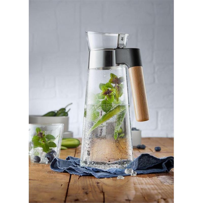Sofistike servis hiç bu kadar güzel görünmemişti: WMF Sürahi, her türlü masa dekoruna göz alıcı bir katkı sağlar. Bu şık meyve demlikli su sürahisi, gelişmiş bir servis deneyimi için modern tasarım parlamasını pratik özelliklerle birleştirir. Geniş açıklık, tüm standart buzdolaplarına uyan kullanışlı bir evrensel formatla kolay doldurma ve temizleme sağlar. Çıkarılabilir süzgeç, buz küplerini ve infüzyon malzemelerini sürahinin içinde tutan zahmetsiz dökme sunar; salatalık suyu, naneli narenciye suyu ve çok daha fazlası gibi lezzetli ev yapımı infüzyonlar için idealdir. Pürüzsüz ve uyumlu tasarım, susuzluğunuzu hiçbir karışıklık olmadan gidermek için sıçramasız ve damlatmayan dökme sunar. Isıya dayanıklı camdan ustalıkla hazırlanmış bu birinci sınıf sürahi, hem sıcak hem de soğuk içecekler için yapılmıştır. Tüm bunlar, masa sanatını daha önce hiç olmadığı gibi deneyimlemek için rahat bir tutuş ve tamamen doğal bir cazibe dokunuşu için pürüzsüz bir ahşap sap dahil olmak üzere zarif modern stille.