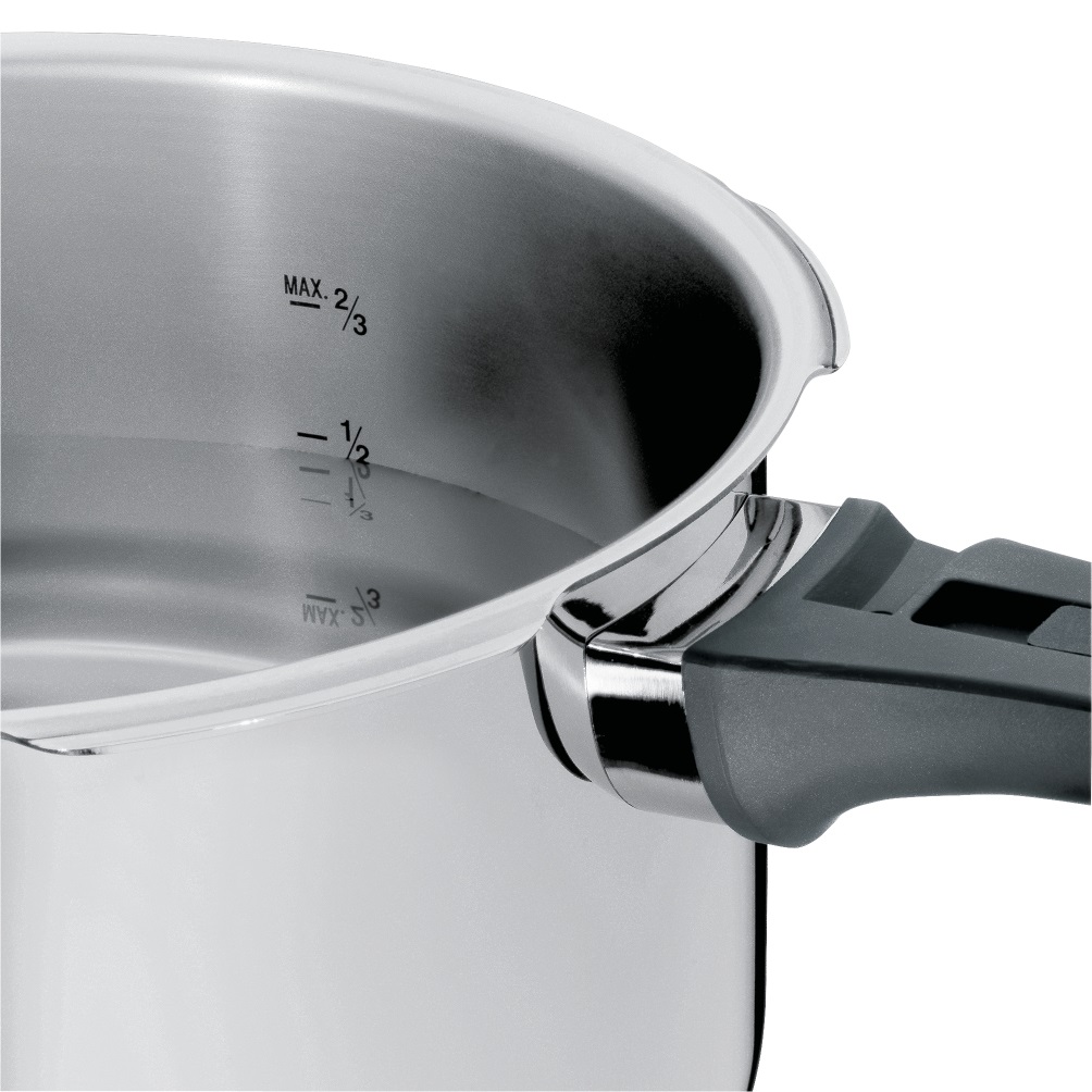 Düdüklü tencerede pişirmek modern, hızlı ve sağlıklı bir pişirme yöntemidir. Yüksek basınç ve yüksek sıcaklıklar geleneksel pişirme zamanını %70e kadar düşürür ve yaklaşık %50 enerji tasarrufu sağlar. Hassas pişirme vitaminleri, mineralleri ve besin maddelerini koruyarak yemeğin lezzetli ve besleyici olmasını sağlar. Pratik: düdüklü tencereler sebzelerden et ve balığa, tahıllar ve bakliyatlardan çorba ve yahnilere tüm yemek türlerini hazırlamak için idealdir. Özel diyet yemekleri ve bebek mamaları bile ideal şekilde pişer. Düdüklü tencere ayrıca pratik kullanımı ve güvenlik özellikleri ile öne çıkar. Özet olarak her açıdan mükemmel ve vazgeçilmezdir. WMF Perfect Plus düdüklü tencereler ileri teknoloji ve modern tasarımı birleştirir. Kontrol mekanizması saptadır. Pişirme göstergesindeki renkli halkalar farklı ayarları ve kademeli basınç güvenliğini gösterir. WMF Perfect Plus, alev korumalı sapı sayesinde gazlı ocaklarda da güvenle kullanılabilir. Yüksek kaliteli 18/10 paslanmaz çelik, Cromargan malzemesi tencereyi hasarlardan korur ve uzun ömürlü kullanım sağlar. Yemek hazırlarken malzemeleri ölçmeyi isteyenler ise tencerelerin içindeki kolay ölçüm için tasarlanmış ölçeğe bayılacaklar. Kullanımı kolaydır ve TransTherm tabanı sayesinde tüm ocak tiplerinde kullanım için uygundur. Bu düdüklü tencereler kolay kullanımlı mutfak yardımcılarınızdır. Temizliği çok kolaydır, sadece tek hareketle sapını kapaktan çıkarın ve suyun altından geçirin, kapağı ve tencereyi bulaşık makinesine yerleştirin.