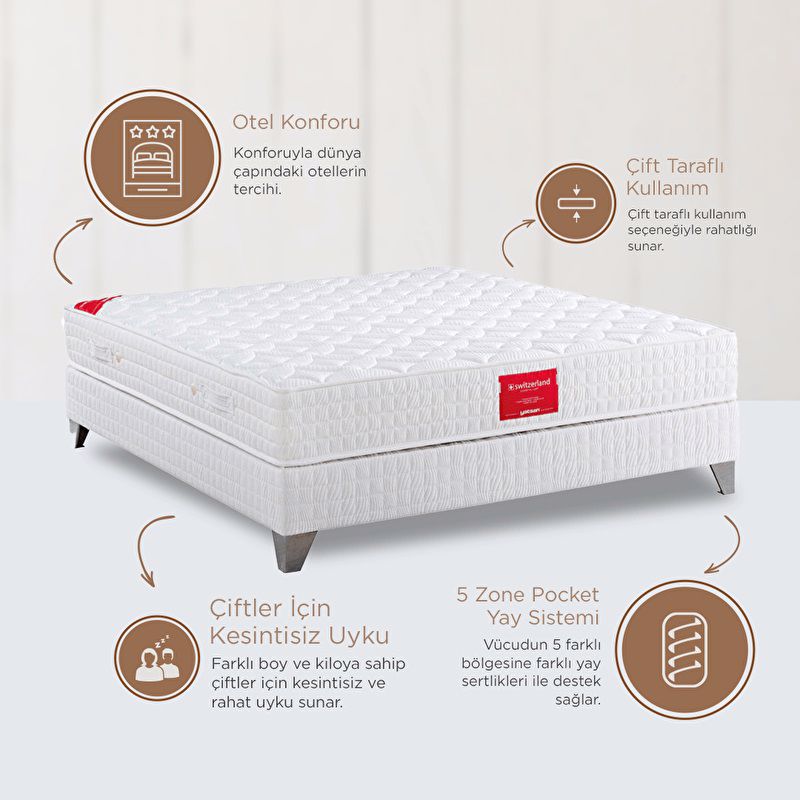 İyi yaşam için iyi uykuyu ilk sıraya koyanların tercihi Switzerland yatak ailesi, eşsiz ergonomisiyle daha ilk denemeden itibaren uyku kalitenizi arttırmak amacı ile tasarlanmıştır. Switzerland serisi yataklarımızla dünyanın en iyi otellerinin kullandığı konforlu yataklara evinizde tatil hissine yer açın. Konforlu ve sağlıklı bir gece uykusuyla tanışın.