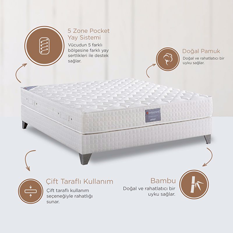 İyi bir hayat için iyi uykunun önemini bilenlerin tercihi Switzerland yatak ailesi, eşsiz ergonomisiyle daha ilk denemeden itibaren uyku kalitenizi arttırmak için tasarlanmıştır. Sert yatak sevenlerin tercihidir. Dünyanın en iyi otellerinin tercihi olan Switzerland yatak ailesinin Premium modeli ile otel konforuna evinizde yer açın.